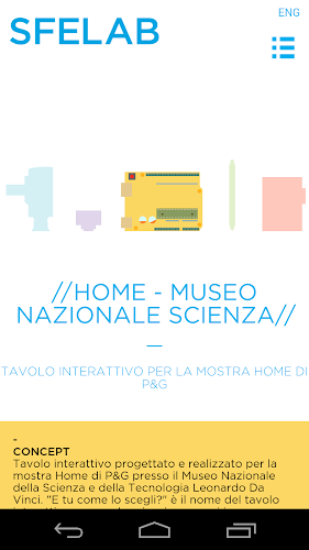 Sfelab è un team di ingegneri e designer specializzati in comunicazione multimediale e installazioni interattive. Lo studio si occupa di ricerca e comunicazione con competenze in diverse discipline: interaction art, web, fotografia, video, grafica, illustrazione.Sfelab è stato ideato e fondato nell'estate del 2011 da Marco Brienza, Giorgio Pagani e Tommaso Nava.