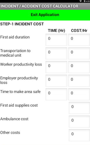 Application ask you the several time and cost based inputs in step by step method and calculate the financial loss you incurred due to any incident or accident occurs at your workplace.It has many question that you may not be considered during the loss calculation by your own.