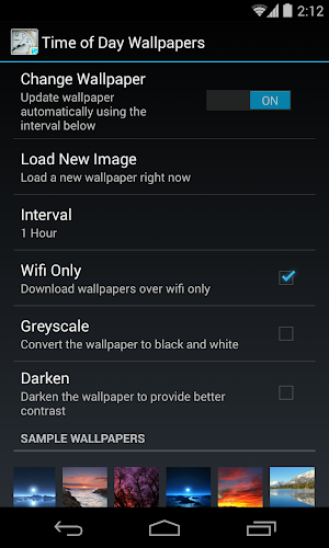 يمنحك خلفيات Time of Day HD بواسطة WallpaperFusion الوصول إلى 100 من صور خلفية الوقت المدهشة من اليوم ، باستخدام موقع جهازك الحالي لمنحك الصور ذات الصلة! سيتم تحميل الصور بشكل عشوائي على مؤقت ، ويمكن أن تكون خضراء أو تغمق تلقائيًا لإنشاء خلفيات خلفية أعلى من ذلك الخيار- خيار لتحميل الصور فقط عبر wifi لحفظها على شحنات بيانات الهاتف المحمول