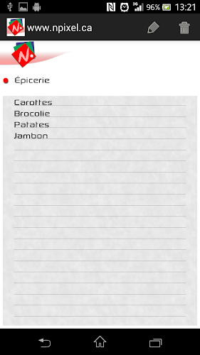 Développé par JL pour N Pixel (www.npixel.ca), le Pixel Note vise les utilisateurs qui recherchent un bloc note électronique avec un visuel agréable et une très grande simplicité d'utilisation. Si vos besoins consistent simplement à conserver en mémoire une chose à faire, un numéro de téléphone temporaire ou y inscrire sa liste d'épicerie, il répondra bien à vos attentes.Vous pouvez très rapidement inscrire un titre qui devient aussitôt un nouvel item à votre liste ou encore y ajouter quelques informations de plus dans un champ de description sous le titre.