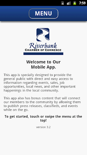 The Riverbank Chamber of Commerce provides business relationships, business advocacies, marketing opportunities, and a wealth of resources to chamber members and the community. The Riverbank Chamber is a voluntary organization. It is comprised of small and large businesses, professionals, and interested individuals who join together to advance the interests of the community at large. The Riverbank Chamber is also a legislative representative, an information bureau, and a business resource tool. The Riverbank Chamber is a non-profit mutual benefit corporation comprised of voluntary members. Riverbank Chamber of Commerce invests its' time, money and resources in the support of programs relevant to members' needs and programs that will benefit the local economy as well as our community.We are currently offering version 3.2.1. This is our latest, most optimized version. It is suitable for many different devices. Free download directly apk from the Google Play Store or other versions we're hosting. Moreover, you can download without registration and no login required.