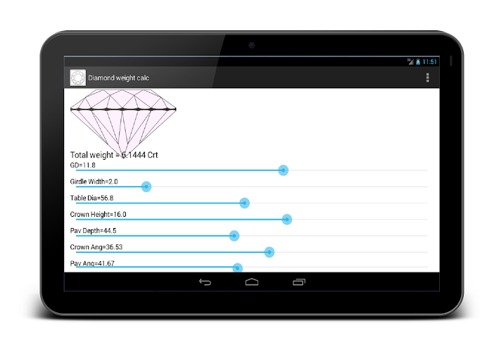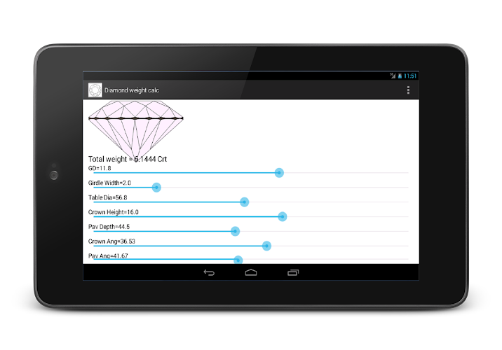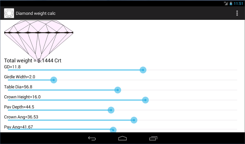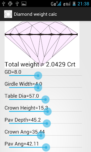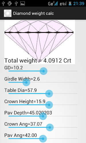 Diamond weight calculator calculates carat weight of diamond or gemstone base on Diameter, Crown height, Pavilion depth, Girdle width, Table and angles. You can change values by scrolling their sliders. You will see immediate measurements of caret weight on screen.General terminology used in the application are as below.