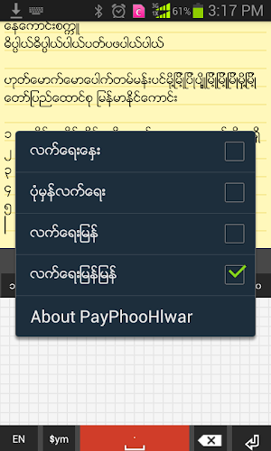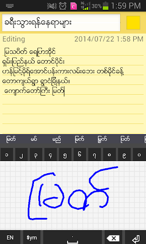 Pay Phoo Hlwar Myanmar handwriting system DescriptionHelp users to write Myanmar (Burmese) language on android phones.Users need not to type in tiny soft-keyboards anymore. Now with PayPhooHlwar,users can write easily with thier own hand.It is...