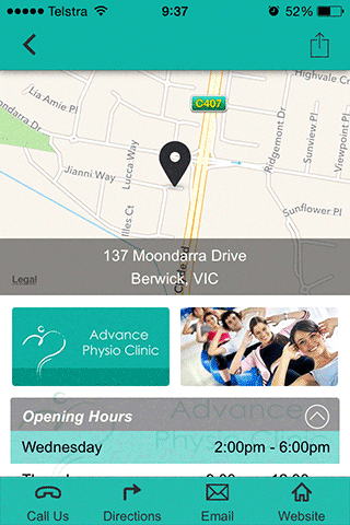 Advance Physio Clinic has three clinics in Melbourne, Victoria. Established in 2004, we use the most comprehensive assessments to accurately and efficiently determine causes of health issues that result in a wide variety of pain symptoms or dysfunction in all body areas. Our focus is on educating our patients about their conditions, and how to effectively manage them. We use the latest in treatment modalities that provide fast and long term results. We're constantly advancing our own skills and knowledge in the fast evolving field of physiotherapy, ensuring we can provide solutions for general physiotherapy, sports injuries, and clinical pilates.Download our free App to read more about us, our services, and related information. You can also make bookings or enquiries, claim loyalty rewards, read and leave reviews, view image galleries, send us a photo for our galleries, catch up with our latest news and events, and engage with our social media like Facebook.