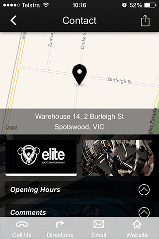Elite Sports Performance is located in Spotswood, Victoria. We're a fitness centre founded on the practical expertise and real world knowledge by some of Australia’s leading sports performance coaches. Our principal aim is to provide elite services to the non-elite, utilising the best coaches, equipment and programming available. We're unmatched in Australia for creating a training environment that promotes work ethic whilst developing a culture that is required to excel at high level sport. All our sessions are supervised, ensuring a structure is followed and purpose achieved.Download our free App to read more about us, our facilities, services and related information. You can also claim loyalty rewards, read and leave reviews, view image galleries and watch our videos, send us a photo for our galleries, catch up with our latest news and events, and engage with our social media like Facebook and Twitter.