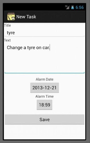 Layout for adding and editing is simple and contains only a few fields: Title, Text, Alarm Date, Alarm Time.