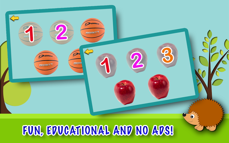 During the counting game, a random number of the same object/animal (a car, a ball, …) is displayed on the screen for your kid to touch them. The repetitive action of counting helps children recognizing the numbers and remembering in which order they appear.