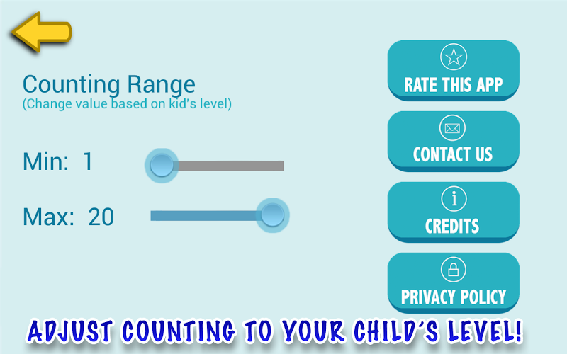 A child knowing how to count till 5 could be overwhelmed by having to count till 20. To adapt to your kid’s level, go to the settings screen and change the counting range more appropriate for your child.