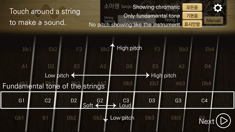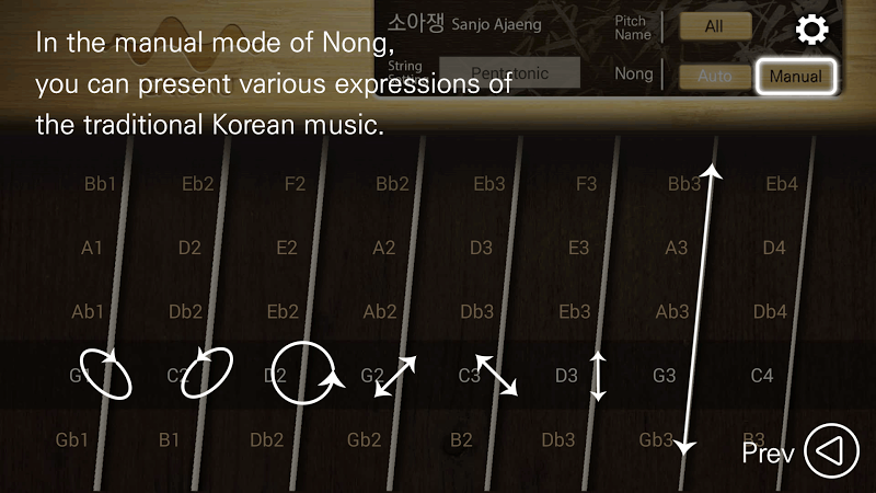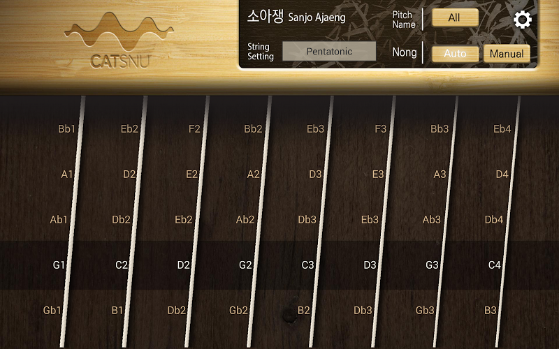 Sanjo Ajaeng app is one of “Gugak”, a mobile application series, which allow users to play traditional Korean musical instruments using mobile devices.Users can play Sanjo Ajaeng by touching strings, and manipulate sound. For example, users can control volume by dragging vertically and control pitch by dragging horizontally.