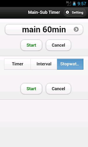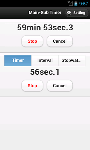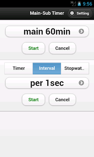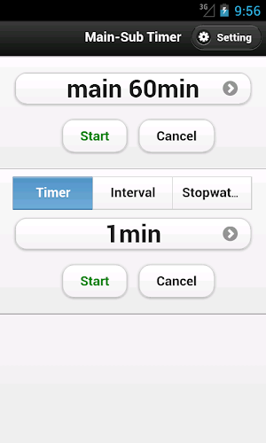 Main-Sub Timer is a timer which measures sub timers (three types of sub timers: timer,interval,stopwatch) in main timer.for example in main 60 minutes timer , you can measure sub timers (for example, 10 minute,10 minute,20 minute,20 minute).