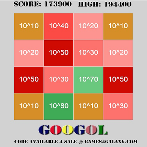 Tired of playing SMALL numbers like three's and 2048's? Now is your chance to play BIG,.. really BIG, GOOGOL BIG (10^100). GO...OGOL