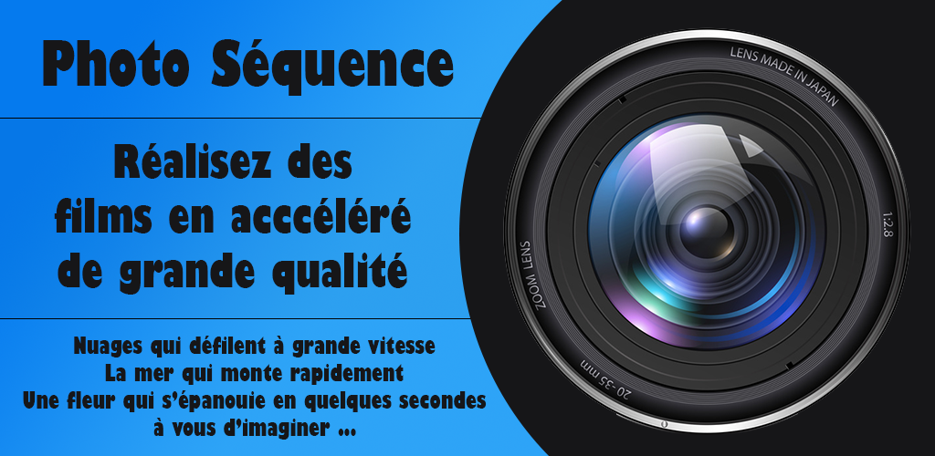 Simple d'utilisation, Photo Séquence est une application complète avec de nombreux paramètres : Affecter un bruitage à chaque photo prise, définir un son à la fin, pour vous prévenir, etc, ... Tout est automatique !