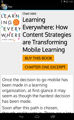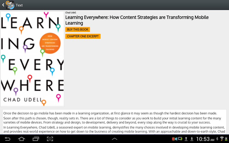 Our Texts tab provides excerpts and links to two of the very best books on the subject, Dr. Clark Quinn’s newly released “Designing mLearning” and Dr. Gary Woodill’s recent title, “The Mobile Learning Edge.” These excerpts are provided free of charge and are included in the app’s download. We’re very pleased to bring this great content to the mobile device of your choice.