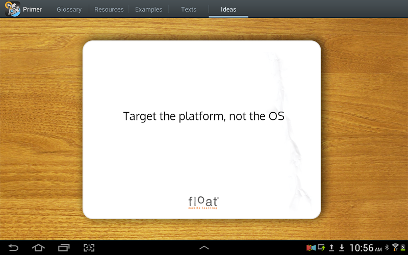 You should consider the Float Mobile Learning Primer to be Mobile Learning 101. The five main areas in the primer consist of a Glossary, a Resources section, an Examples area, some Excerpts from two great books on mLearning and finally, a lateral thinking tool, Idea Starters.The Glossary has over 200 mobile and mobile learning related terms defined for you in order to assist with the ever-increasing amount of acronyms, technologies and buzzwords we encounter in learning every day.