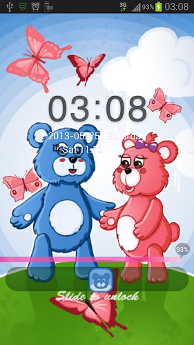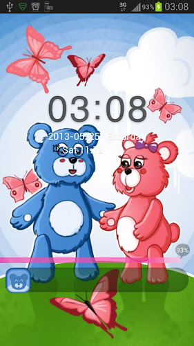 New Teddy Bears Theme GO Locker can be downloaded for free, straight from the Google Play Store. This cheerful, sweet, charming, full of joy and fun theme for all who love stuffed animals. Shows child's toys like two bears, one in blue (he) the other in red (she), playing on the green meadow. The fairy - tale scenery is adorned with pink butterflies, fluttering against the blue sky and white clouds. Everything is light and pleasant, floating in the clouds, like the view from the children's toys dreams. Thread especially for girls who love color rose and soft cute plush toy or everyone with romanticism emotionsIf you do not have this theme, please download it as soon as possible and let the teddy bear live on your lock screen phone