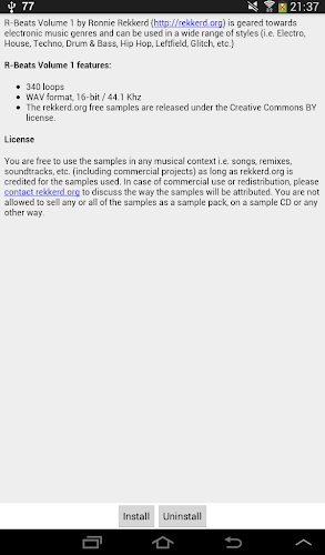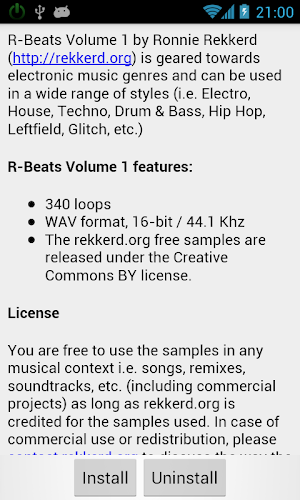 ★★★ IMPORTANT! ★ This is sample add-on for GrooveMixer app (that must be installed separately) ★★★R-Beats Volume 1 by Ronnie Rekkerd - http://rekkerd.org - is geared towards electronic music genres and can be used in a wide range of styles (i.e. Electro, House, Techno, Drum & Bass, Hip Hop, Leftfield, Glitch, etc.).
