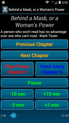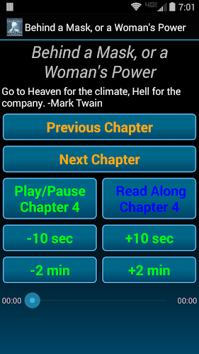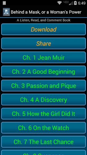 I am happy to provide you with Behind a Mask,or a Woman's Power, a chapter by chapter audiobook. And like a real book you can link to the best online text at the Literature Network www.online-literature.com.- hughesmathFans of Louisa May Alcott's Little Women will remember that her heroine Jo wrote racy novels before turning her hand to more "serious" literature. Alcott, writing under the pseudonym A. M. Barnard, often did the same, and Behind a Mask (1866) is one of her sensation novels. It focuses on Jean Muir, who enters the home of the wealthy Coventry family as governess to their sixteen-year-old daughter. But is the beguiling Miss Muir all that she seems to be? (Introduction by Elizabeth Klett -Narrator)
