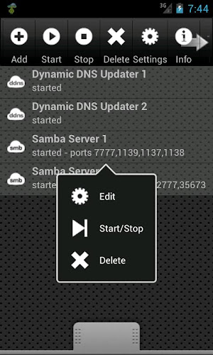 - For every Samba Server you can set name, TCP/IP port, session port, name server port, datagram port, multiple directories to share, use root for internal port forwarding, enable logging, only log errors, start the server when connected to a specific WIFI network and disconnect when the WIFI network is lost, or start on boot