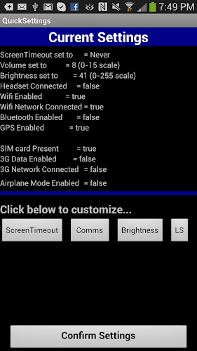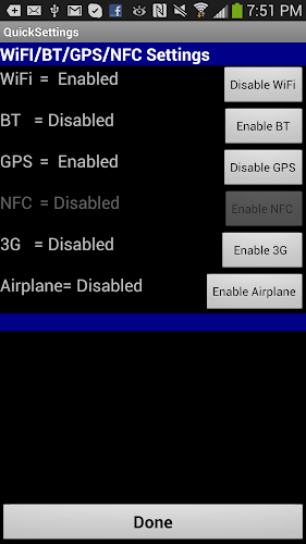 This application provides quick access enable or disable to system settings via a single configurable view. This application is displaying and monitoring system settings in single view.Quickly turn on/off settings (such as Airplane, Bluetooth, GPS, 3G, Brightness, ect...) in a single screen.
