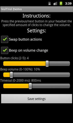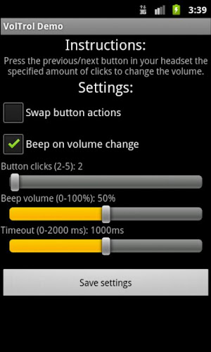 This application allows to control the media volume using the 3 buttons of the headset (Android compatible) by pressing the specified amount of times the next/previous buttons.Only tested on HTC Desire Z. Leave your comments and recommendations.