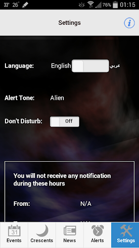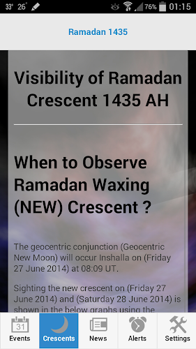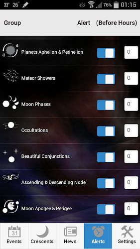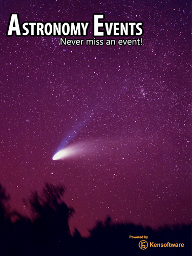 Never miss an astronomical event! Astronomy Events does not only list the important astronomical events, but it also sends you a notification to inform you about a current event. The user gets basic description about each event once the events is clicked. In addition, the application has a News menu in which you can find some important astronomical news. Moreover, you will receive Push Notification for important news such as seeing the crescent in a certain country. Also, the application has a tab for crescent sighting, in which the user can view crescent sighting predictions for the current year and can also read the crescent observation results of the previous months. The events which this application lists and send push notification for are:-- Moon Phases