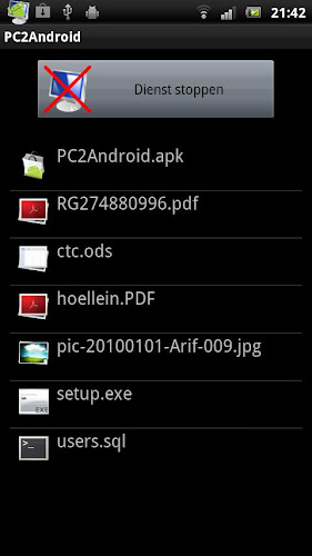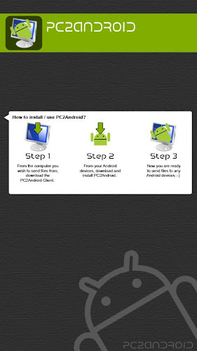 With PC2Android you can easily transfer your files from your computer to your Android devices via wifi - without any usb cable! Works on windows, linux and mac! Just drag & drop your files on your device!Install the client for your computer fom: http://www.pc2android.com/downloads