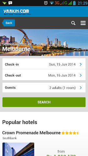 Find Hotels in Melbourne with the best prices for 450,000 + hotels worldwide. Use application Melbourne Hotel Comparison to compare prices from hundreds of other travel sites (Expedia, Hotels.com, etc..) With one search. By using the application, no need to spend hours searching and comparing prices on various websites and travel applications. We instantly compare hotel deals from hundreds of reputable travel sites - including Expedia, Tiket.com, HotelClub, Hotels.com, Lastminute.com, Venere.com, EasytoBook.com, Get a Room, and much more.product features