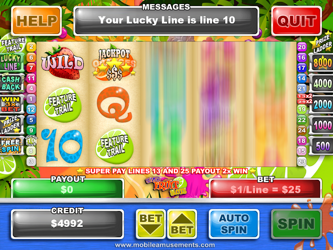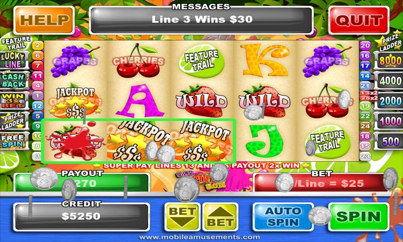 Super Fruit Slots the 5x3 reel fruity themed casino slot machine where you can win a virtual cash fortune!Try to win as much cash as possible by also playing features such as the Feature Trail and Prize Ladder to accumulate virtual credit prize...