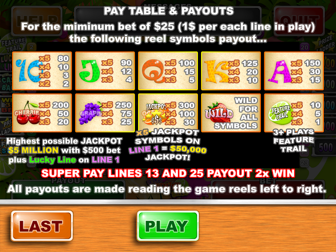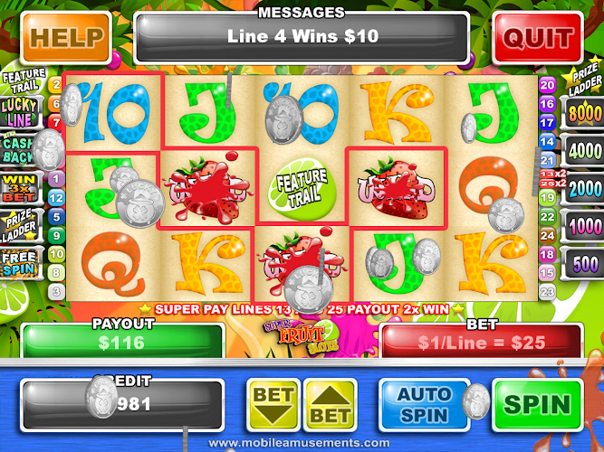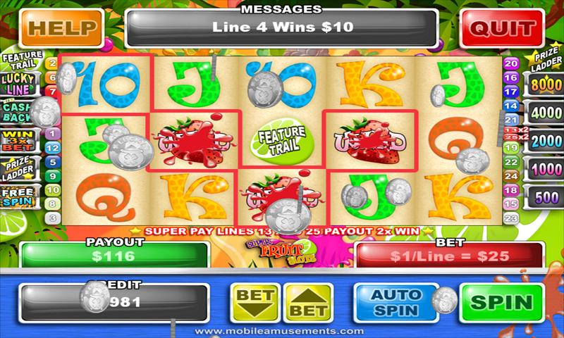 Super Fruit Slots the 5x3 reel fruity themed casino slot machine where you can win a virtual cash fortune!Try to win as much cash as possible by also playing features such as the Feature Trail and Prize Ladder to accumulate virtual credit prize bonuses.