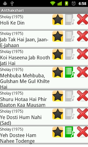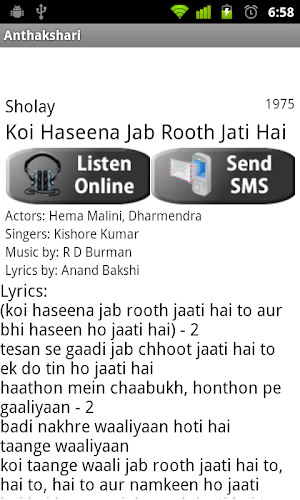 Anthakshari is designed and developed by Nava Apps. As the name suggests, this is an app where you can look up the lyrics of the hindi movie songs that start with any syllable (or staring letter) you desire. The app is designed to help you play the game with your family and friends. You can search any song anytime on your phone now based on the name of the movie or actors and actresses or singers or music directors or lyricist. Simple to use and easy to understand, this app is a cool addition to your smartphone. This is VERSION 2.0. If you have any suggestions, please leave a comment and we will try and incorporate them into the next version update.In the next update we will add more Hindi song lyrics, add Telugu and Tamil movie song lyrics.