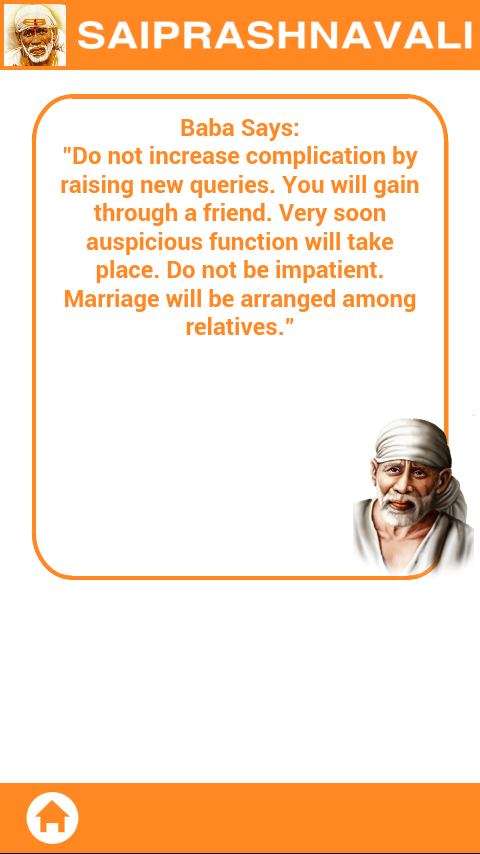 "Your Questions and Shri SaiBaba's Answer" was a famous book published by Shri Madhav Lele for the benefit of Shri Sai's devotees seeking Baba's advice at difficult times. It is believed that Shri Sai Baba uses this book as a medium to convey the appropriate message to his devotees who are seeking his guidance. The book contained 720 messages and instruction on how to use this "SAI PRASHNAVALI" to get an answer from Baba. We are blessed to make this book and the system available in the form of a Mobile application. The original book contained messages only in english. With some additional effort and Shri Sai's blessing we are providing this in 3 languages