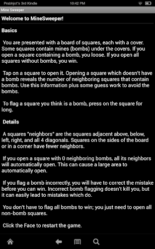 You are presented with a board of squares, each with a cover. Some squares contain mines (bombs) under the covers. If you open a square containing a bomb, you loose. If you open all squares without bombs, you win.