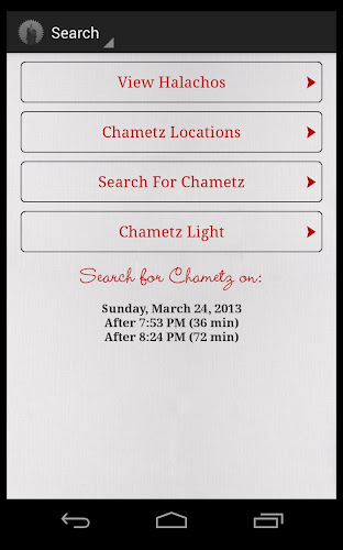 The app helps you search for Chametz, the bedikat chametz, by giving you the halakhah, brachas zmanim, a checklist builder and a flash light. It also helps you destroy the chametz with the Bittul and Bi'ur with halakhah, brachas and zmanim for that process. Finally, it helps you sell, Mechirah, the chametz with zmnaim, halacha and a link to sell it to an organization.