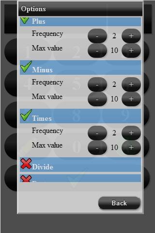 Each mathematical operation Plus (addition), Minus (subtraction), Times (multiplication), Divide (division) and Factors (especially useful to prepare for notoriously difficult 60-second sweep) can be either opted out, or once selected can be configured for frequency. Plus, Minus and Times also can be configured for the Max-Value – maximum result for addition, or max first operand for subtraction and multiplication. This way, for example, the parent can configure the test for infrequent subtraction from numbers as large as 30 and more frequent multiplication by 2, 3 and 4, so the child still practices subtractions while starting to study multiplication table.