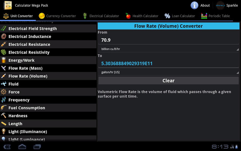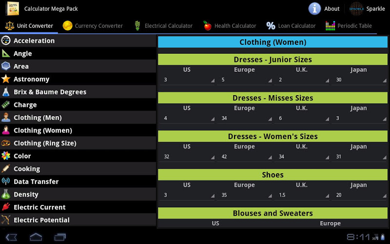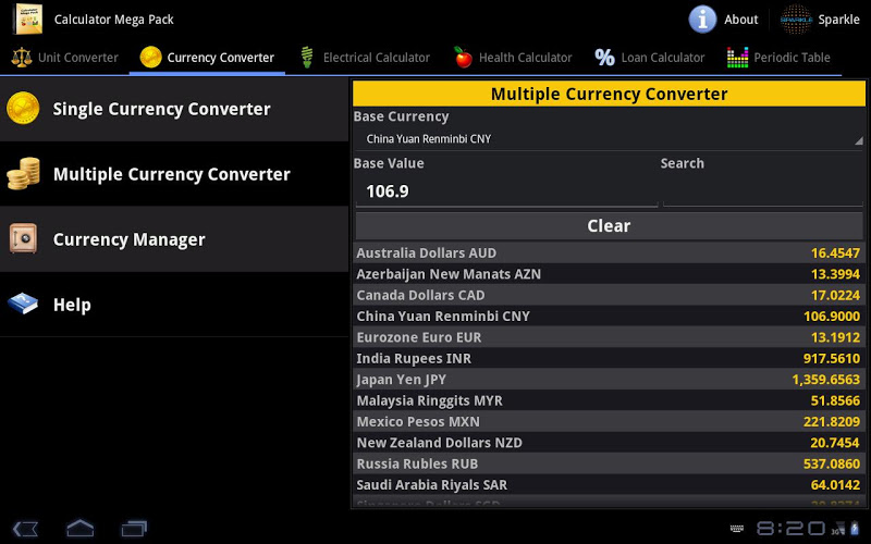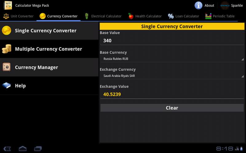 Calculator Mega Pack is a complete collection of essential calculators. The pack contains Unit Converter, Currency Converter, Electrical Calculator, Loan Calculator, Health Calculator and Periodic Table. A Comprehensive Learning aid & Educational Utility.Unit Converter: