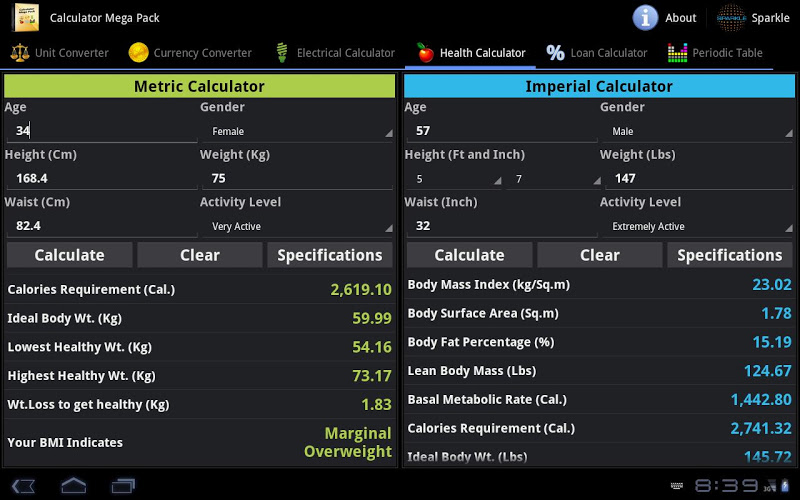 Health Calculator provides the most efficient way to analyze your Health and Fitness. 11 Most Vital and Accurate Health Measurements are provided with detailed Definitions and Specifications. Supports both Imperial and Metric forms of Calculation.