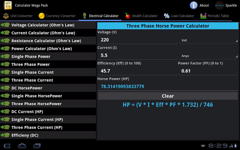 Electrical Calculator contains 39 Calculators, that can quickly and easily calculate different electrical parameters. Automatic Calculations and Conversions with every Unit and Value Changes.