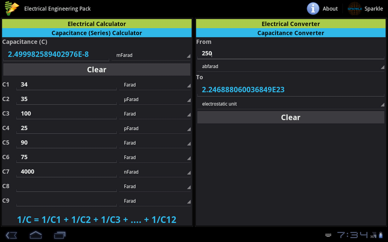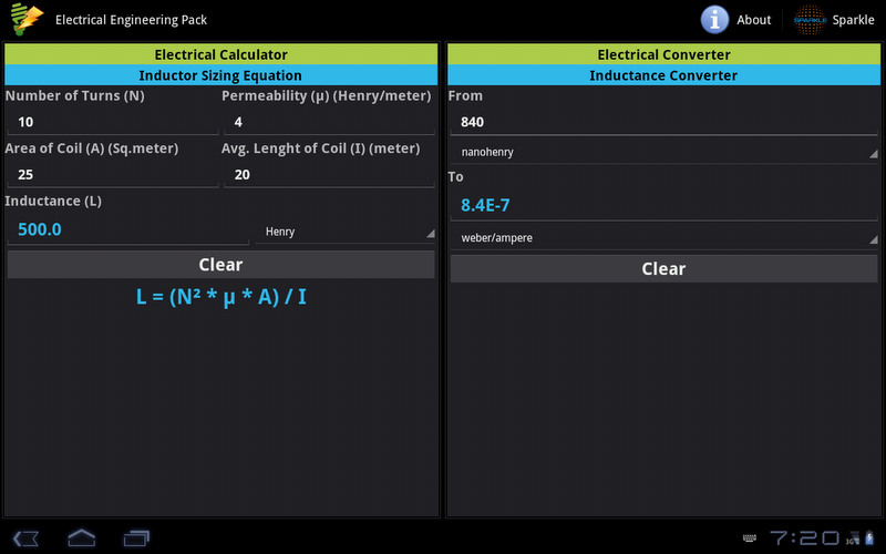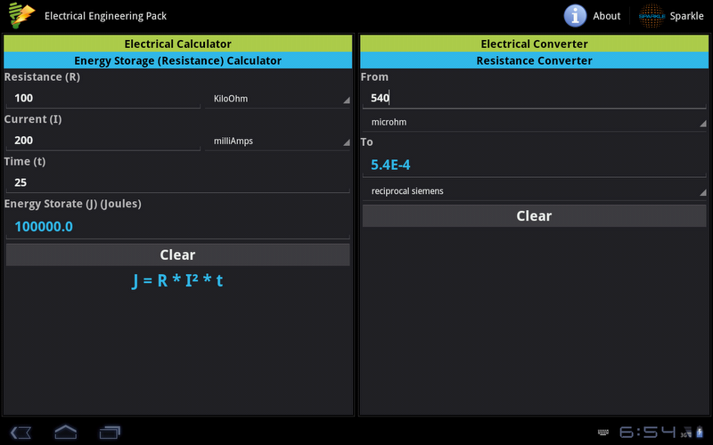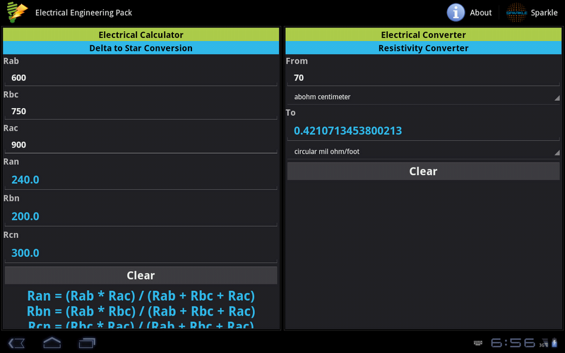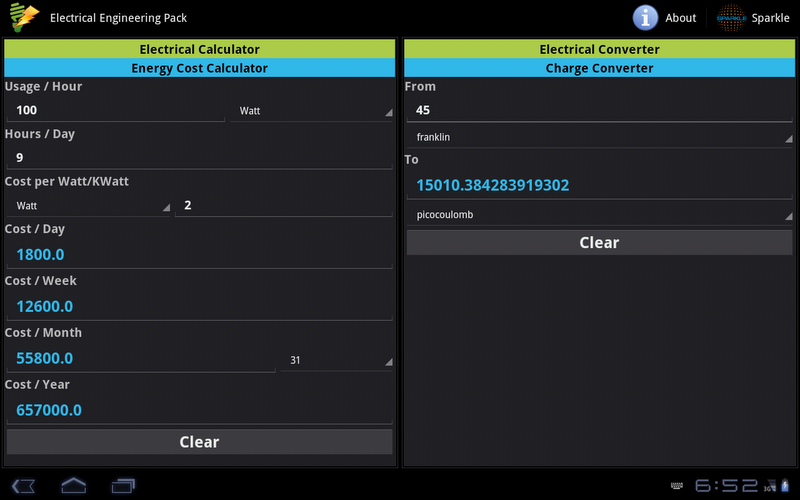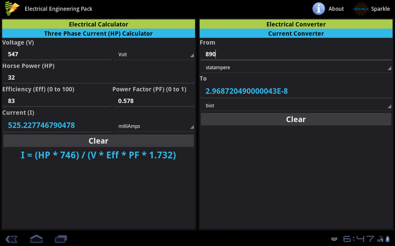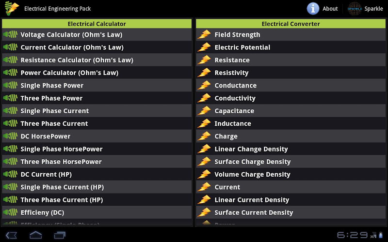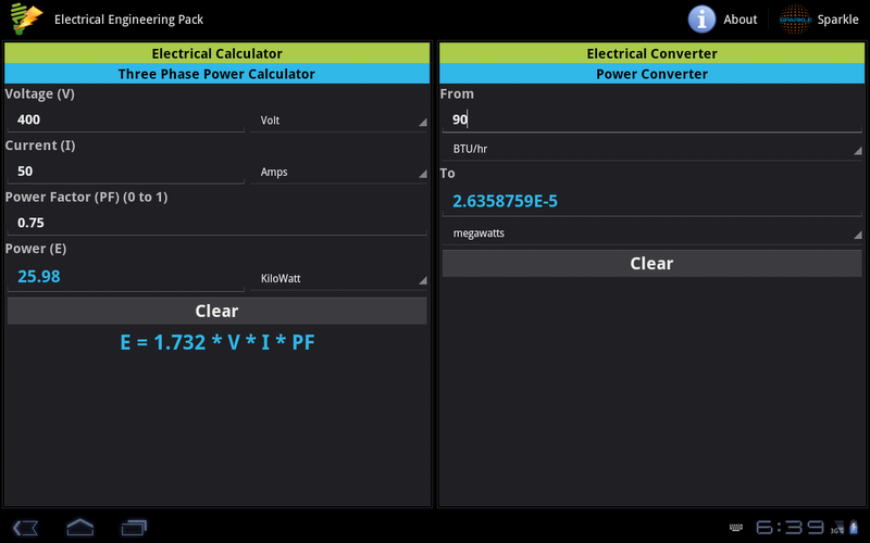Electrical Engineering Pack consists of 39 Electrical Calculators and 16 Electrical Converters. A complete guide for Electrical Engineers, Technicians and Students.Electrical Calculator contains 39 Calculators, that can quickly and easily calculate different electrical parameters. Automatic Calculations and Conversions with every Unit and Value Changes.
