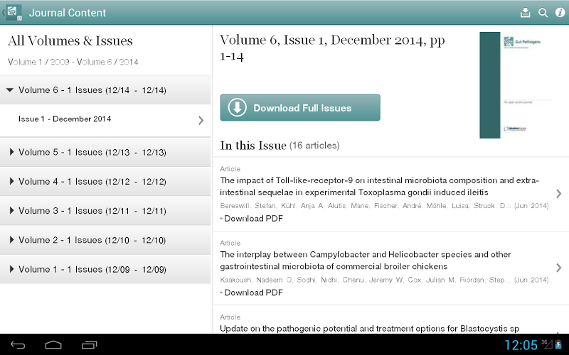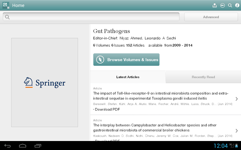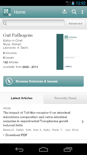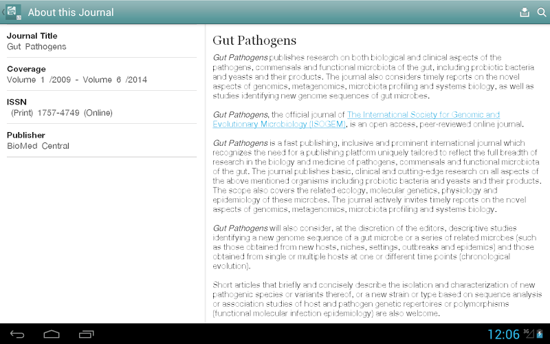 Tap into the most recent developments in research on both biological and clinical aspects of the pathogens, commensals and functional microbiota of the gut with the Gut Pathogens app. Gut Pathogens is a peer-reviewed, open access journal published by BioMed Central. The Journal publishes research on both biological and clinical aspects of the pathogens, commensals and functional microbiota of the gut, including probiotic bacteria and yeasts and their products. The journal also considers timely reports on the novel aspects of genomics, metagenomics, microbiota profiling and systems biology, as well as studies identifying new genome sequences of gut microbes. This free app provides valuable features including: - Save and share articles - Advanced search - Document details - including abstractsCoverage includes: microbial etiology of gut ailments; gut invasion mechanisms; microbial toxins and virulence factors in infections of the gut and associated glands - liver, pancreas; bacterial adaptation to gut niches and evolution of pathogenicity; biology and ecology of gut commensals and microbiota in health and disease; biology and ecology of probiotic organisms; host susceptibility or resistance to gut pathogens; immune mechanisms of gut infections; etiology of inflammatory bowel diseases; molecular and serological diagnosis; treatment and drug resistance mechanisms; molecular epidemiology, transmission dynamics and evolutionary genetics; vaccines for gut pathogens; comparative and veterinary infectious diseases of the gut; pathogenesis of bacterial, parasitic and viral infections of the gut; genome sequencing, comparative genomics and systems biology; microbiota analysis, metagenomics and gut microbiomes.
