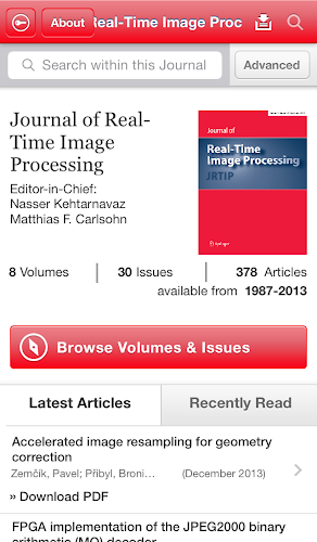 Tap into the most recent developments in the theory and practice of image processing with the Journal of Real-Time Image Processing app. The Journal of Real-Time Image Processing is a peer-reviewed journal published by Springer Science+Business Media. The Journal publishes original articles that bridge the gap between the theory and practice of image processing and covers real-time image processing systems and algorithms for industrial, medical, consumer electronics, portable and embedded device applications.This free app provides valuable features including: