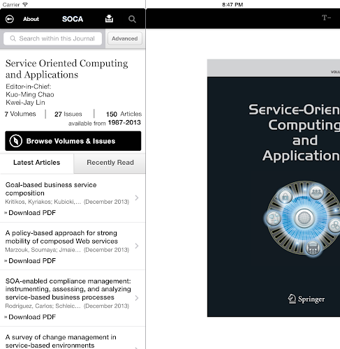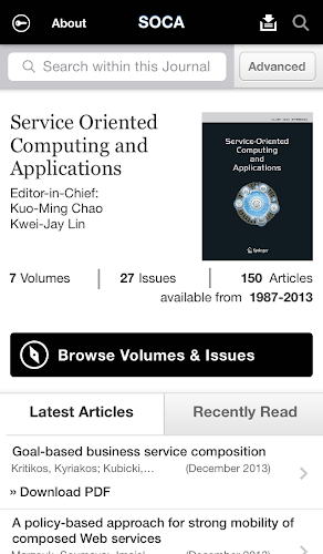 Tap into the most recent developments in the field of service-oriented computing with the Service Oriented Computing and Applications app. Service Oriented Computing and Applications is a peer-reviewed journal published by Springer Science+Business Media. The Journal publishes original articles that cover service-oriented computing (SOC) paradigm, models and technologies, including web service standards, service infrastructures, theoretical foundations and their applications and experiences in service-oriented computing.This free app provides valuable features including: