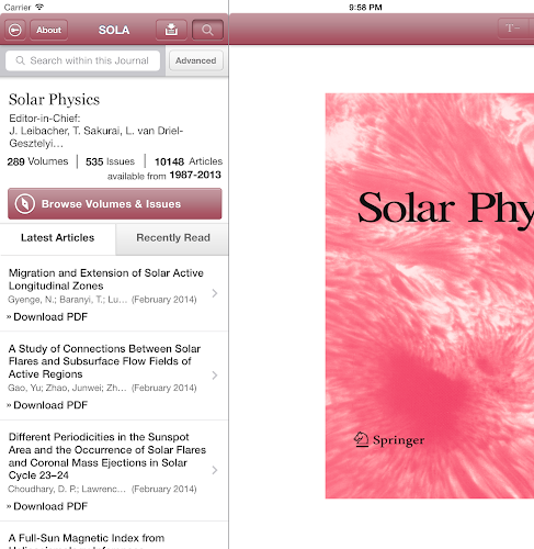 Tap into the most recent developments in the field of solar physics with the Solar Physics app. Solar Physics is a leading peer-reviewed journal published by Springer Science+Business Media that offers relevant papers on stellar research and solar-terrestrial physics. The Journal's coverage ranges from the internal structure of the Sun and its evolution to the outer corona and solar wind in interplanetary space, as well as solar-terrestrial physics and stellar research, where they contribute directly to our understanding of the Sun.This free app provides valuable features including: