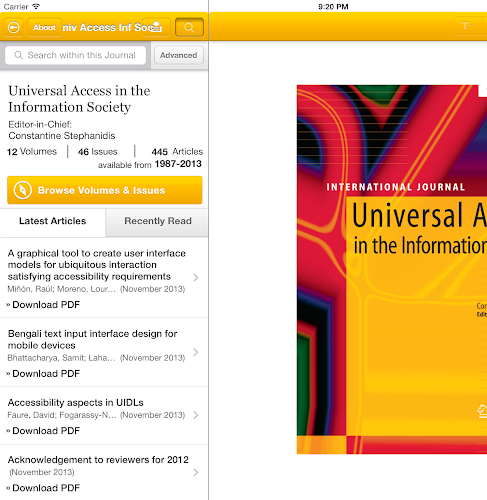 Tap into the most recent developments in research on the accessibility, usability, and, ultimately, acceptability of Information Society Technologies by anyone, anywhere, at anytime, and through any media and device with the Universal Access in the Information Society app. Universal Access in the Information Society is a peer-reviewed journal published by Springer Science+Business Media. The Journal publishes original articles that report on theories, methods, tools, empirical results, reviews, case studies, and best-practice examples that addresses equitable access and active participation of potentially all citizens in the information society.This free app provides valuable features including: