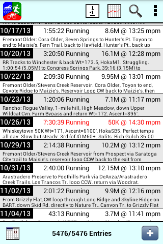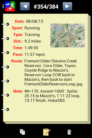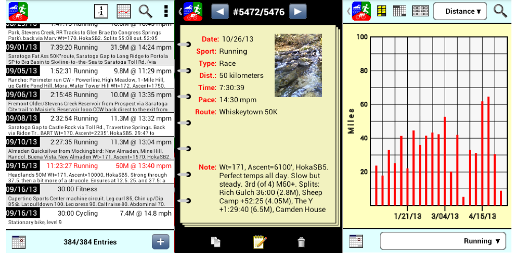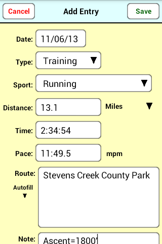 o Record distance, time, and pace (enter any two and the third is automatically calculated), along with date, sport, category (race, training, or interval workout), route or workout description, and notes.