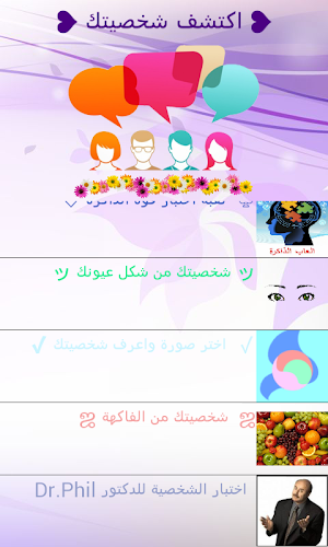 Application combines more than 10 Abart scientific and psychological analysis of personal and discovered this Thasinaaydm application: "♥ character of the way you're sitting ♥", "ツ character of the way Dehketak ツ", "♫ character of the way you sleep ♫", "∀ character of the name ☂ letter", "Ü character of your horoscope ✈", "✌ Are you someone snobby ♔", "♤ game test memory strength ♡", "ッ character of the shape of your eyes ッ", "✓ Select a picture and know your character ✔", "ஜ character of fruit