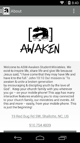 ASM-Awaken Student Ministries App Experience ASM anytime, anywhere Yes, put all this at your fingertips--with the state of the art app for your iPhone or android. This app is free and gives you unlimited access to these great features: Media-- listen from home or anywhere! Instantly access keynote messages. All these resources are literally in the palm of your hand! Events—stay up-to-date on events happening. Add events to your own calendar, set reminders, get directions, and share with friends—on the spot! Contact Info —Got questions? Call or e-mail us directly from the contact page. Support the ASM! - With just two clicks! Completely secure, you can make gifts or donations to support ASM simply and quickly. Invite Others and Share - Share content effortlessly on your favorite social site: Facebook, Twitter, SMS, and e-mail. “Go viral” with anything and everything, and help others stay connected!We are currently offering version 2.1.1. This is our latest, most optimized version. It is suitable for many different devices. Free download directly apk from the Google Play Store or other versions we're hosting. Moreover, you can download without registration and no login required.