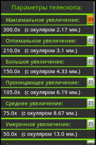 Calculator program for calculation of parameters and characteristics of the telescopes of all systems (magnification, field of view, the exit pupil) using different eyepieces.This is a handy tool for those who choose the telescope eyepiece for him.