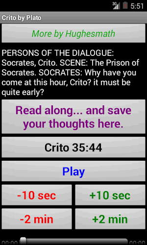 Android App Analysis and Review: Crito by Plato audio and text, Developed by HughesMath. Listed in Music & audio Category. Current Version Is 1.0, Updated On 20/03/2014 . According to users reviews on Google Play: Crito by Plato audio and text. Achieved Over 500 Installs. Crito by Plato audio and text Currently Has 3 Reviews, Average Rating 5.0 Stars