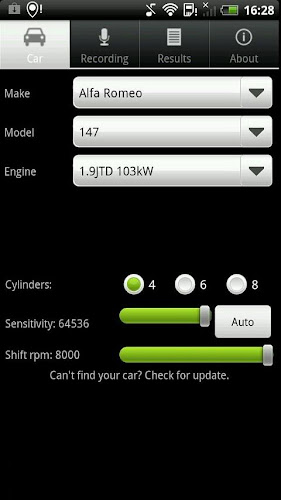 1. Po spuštění tachometru CIRI RPM vyberte prosím parametry automobilu (nebo podobného vozidla), zkontrolujte, zda je počet válců správný pro vaše auto.