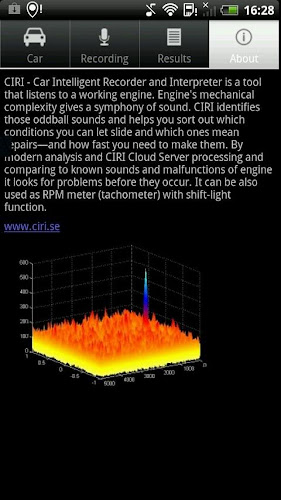 otáček otáček za otáčkami a směny pro automobily a vrtulníky je součástí projektu CIRI - Free CIRI RPM Tachometer a Shift Light Version - ukazuje otáčky (rychlost motoru) a řadicí světlo (obrazovka zamrdí žlutě při nastavení RPM) pomocí akustického z -transformu. Může být použit pro automobily (jakýkoli typ motoru) a pro vrtulníky (pro 2-5 lopatky, 1-4 rotory). systémy. V některých případech lze takové možnosti vypnout z nabídky z telefonu „Nastavení“. Například to nefunguje správně s HTC EVO 3D (lowband Microfone je filtrován telefonicky)CIRI - CAR Inteligentní rekordér a tlumočník je nástroj, který poslouchá pracovního motoru. Mechanická složitost motoru dává symfonii zvuku. CIRI identifikuje tyto podivné zvuky a pomůže vám vyřešit, které podmínky můžete nechat sklouznout a které z nich znamenají opravy - a jak rychle je musíte udělat. Moderní analýzou a zpracováním cloudového serveru CIRI a porovnáváním se známými zvuky a poruchami motoru hledá problémy dříve, než k nim dojde. Lze jej také použít jako měřič RPM (Tachometer) s funkcí Shift-Light.